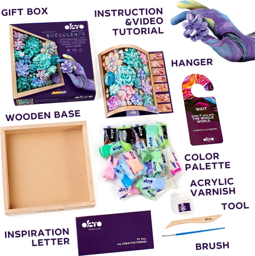 Kreatív készlet alkotni szeretőknek és kezdőknek. Készítsen élethű pozsgásokat levegőn száradó gyurmából, és állítsa ki őket az elegáns 21 × 21 cm-es fa keretben. A csomag mindent tartalmaz – gyurma, formázó eszköz, ecset és képes útmutató – csak nyissa ki, és kezdjen alkotni.