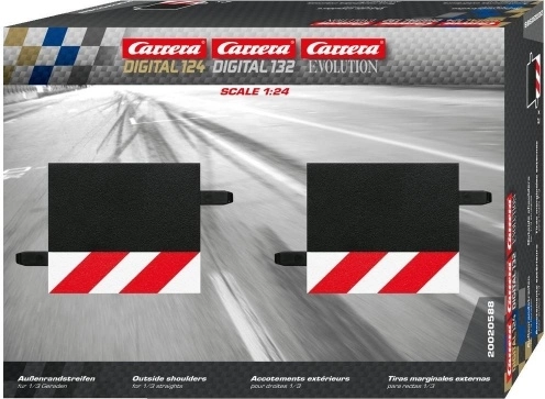 Bővítse versenypályáját biztonságos és élethű szegélyekkel. Ezek a szegélyek az 1/3 egyenes szakaszhoz kompatibilisek a CARRERA EVOLUTION, DIGITAL 132 és DIGITAL 124 autópályákkal. A csomagban 4 darab található, amelyeket könnyedén csatlakoztathat az 1/3 egyeneshez (ref. 20611) a modellek jobb stabilitásáért és a simább futásért.