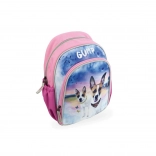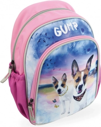 A hátizsák színes elülső panellel, kutyaillusztrációkkal és 'GUMP' felirattal díszített, így vonzó kiegészítő.