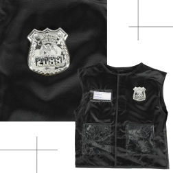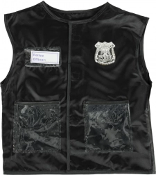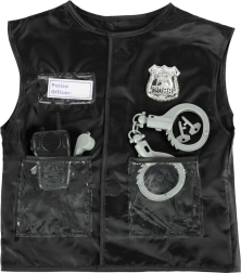 A mellény átlátszó zsebekkel, ezüst jelvénnyel és 'Police Officer' feliratos címkével rendelkezik, ami lehetővé teszi a gyerekek számára, hogy igazi rendőrnek érezzék magukat.