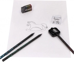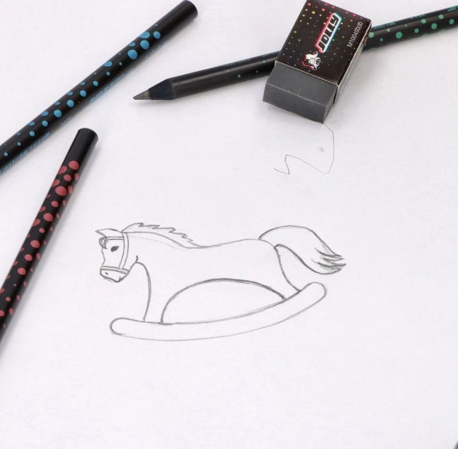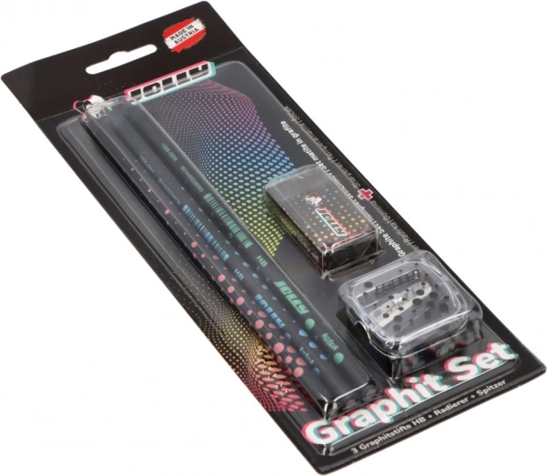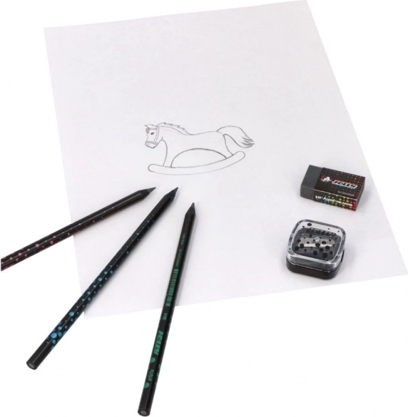Jolly Next Gen ceruzakészlet ideális választás gyerekeknek és felnőtteknek, akik minőségi rajzeszközöket keresnek. Tartalmaz mindent, amire szükség lehet rajzoláshoz: három ceruza, radír és hegyező.