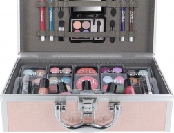 Rózsaszín „Eye-Catcher” kozmetikai táska beépített tükörrel – összesen 42 darab tartozékkal. Tartalma: 24× szemhéjpúder, 2× körömlakk, 1× csillámos körömlakk, 1× pirosító, 2× rúzs, 2× ajakfény, 3× szemceruza, 1× szemkontúrceruza, 3× kétoldalú applikátor, 1× ecset. Bőrgyógyászatilag tesztelt, megfelel az EU szigorú előírásainak.