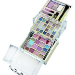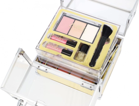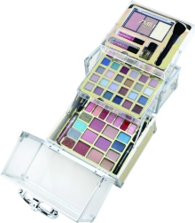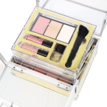 Elegáns kozmetikai bőrönd luxus arany kivitelben, amely mindent tartalmaz a mindennapi sminkeléshez és a különleges alkalmakhoz. Összesen 64 db tartozékot foglal magában, széles választékban szemhéjpúderekkel, rúzsokkal és sminkecsetekkel. A kompakt akril kivitel tartós és áttekinthető. A termék dermatológiailag tesztelt és megfelel az EU szigorú szabványainak.