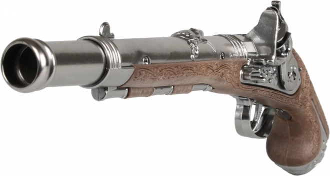 Keltsd életre a kalózkalandokat a fémből és műanyagból készült, autentikus kidolgozású pisztollyal. A díszes vésések és a fa hatású markolat történelmi kovás pisztolyt idéznek, amely kiválóan illik jelmezekhez és tematikus ünnepségekhez.