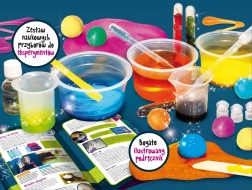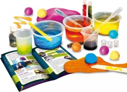 Lenyűgöző és egyben „nyálkás” készlet, amellyel a gyerekek ragacsos masszából szórakoztató és kreatív dolgokat készíthetnek, többek között pattogó labdákat, szörnysejt szereket, mozgó homokot, húzható zselét vagy mókás gyurmát. A termék biztonságos reagenseket tartalmaz. Figyelmeztetés: A nyálkák színt váltanak és pattognak! Tartalom: védőszemüveg, pipetta, spatula, reagensek, színezékek, mérőedények, palack, kémcsövek.