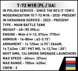 A COBI építőkészlet hűen ábrázolja a modernizált T-72M1R harckocsit, amelyet Lengyelországban és Ukrajnában használnak. Az 1:35 méretarány tökéletesen illeszkedik az Armed Forces sorozat további modelljeihez. Az új, speciális elemnek köszönhetően a jellegzetes futókerekek, a forgatható torony, a mozgatható löveg és a működő lánctalpak építés, játék és kiállítás során is élményt nyújtanak.