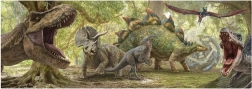 A kirakó különféle dinoszauruszok részletes illusztrációit tartalmazza, a Tyrannosaurustól a Triceratopsig, természetes környezetükben.