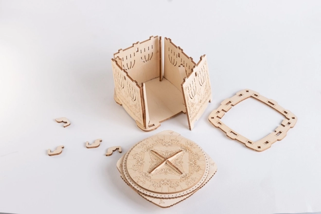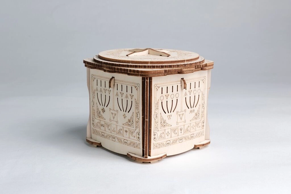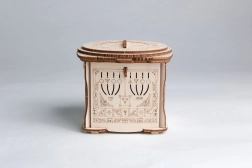 Dekoratív gravírozás és átgondolt mechanizmus gondoskodik a szórakozásról és a stílusos megjelenésről a belső térben. A doboz egyszerre fejtörő és dizájn kiegészítő.