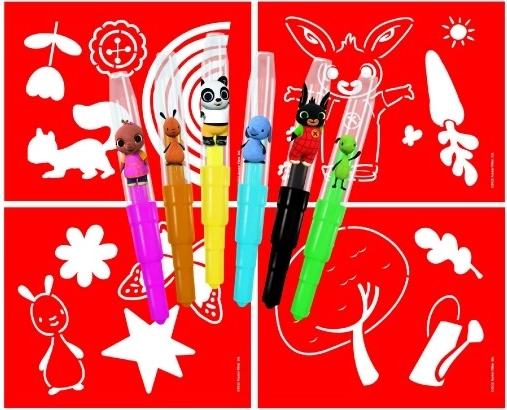 A BING fújós filctoll készlet minden kis művészt elvarázsol. A hat színes toll és a tematikus sablonok segítségével könnyen készíthetők egyedi képek kedvenc figurákkal. Az egyszerű fújás finom átmeneteket és spray-hatásokat hoz létre rendetlenség nélkül.