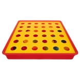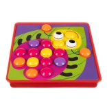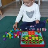 A nagy, színes pöckök könnyen illeszthetők a nyílásokba, ami támogatja a mozdulatok pontosságát, a fogást és a szem–kéz koordinációt a kisgyermekeknél.