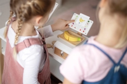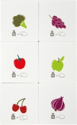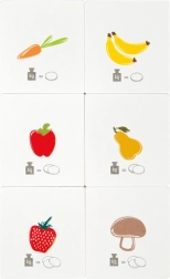 A csomagban hat kétoldalas kártya található élelmiszer-ábrákkal és érmékkel, amelyek szemléltetik, hogy több érme magasabb árat jelent kilogrammonként. A játék természetes módon fejleszti a alapvető matematikai készségeket, a finommotorikát és a kéz–szem koordinációt. A fa és műanyag masszív kivitele hosszú élettartamot és biztonságos használatot garantál.