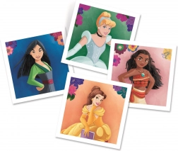 A játék gyönyörű illusztrációkat tartalmaz a kedvenc Disney hercegnőkről, amelyek minden kis meserajongót elvarázsolnak.