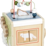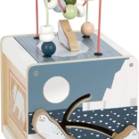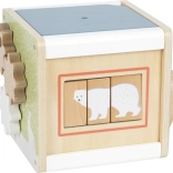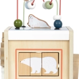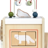Ez a sokoldalú motorikus kocka sarkvidéki állatmotívumokkal (jegesmedve, fóka, rozmár és mások) átgondolt, fejlesztő játék 12 hónapos kortól. A két gyöngypályának, a forma bedobónak, a csúszó labirintusoknak, a forgó lapoknak és a fogaskerekeknek köszönhetően a gyerekek fejlesztik szem-kéz koordinációjukat, türelmüket és térérzékelésüket. A levehető tető lehetővé teszi az elemek egyszerű tárolását a belső térben.