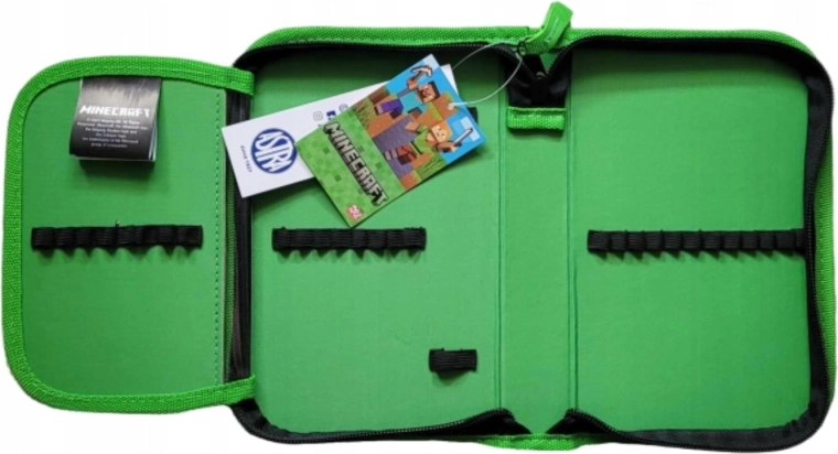 Egyemeletes iskolai tolltartó egy lehajtható füllel, Minecraft mintával.