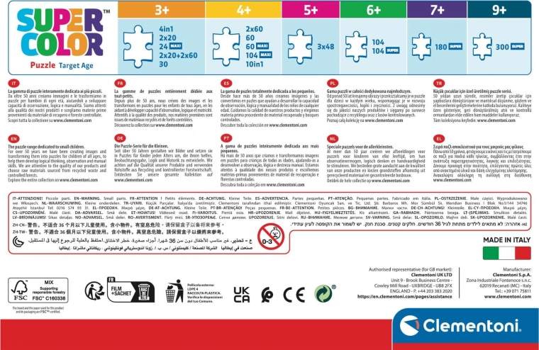 Két gyerekpuzzle azonos darabszámmal és azonos mérettel. A SuperColor Collection – kifejezetten gyerekeknek tervezett kiadás – segíti a kézügyesség és a megfigyelőképesség fejlesztését. Az anyagok minősége és az exkluzív nyomtatási technika tartósan gyönyörű, élénk és ragyogó színeket biztosít.