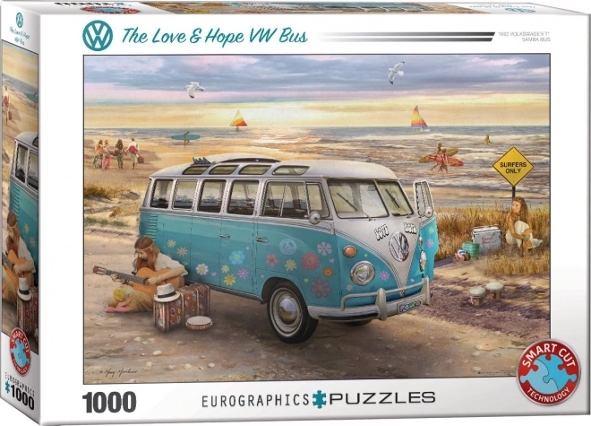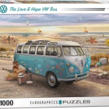 Élvezze az átgondolt kirakót a Eurographics márkától, VW Busz – Szerelem és remény motívummal. A speciális, rácsmentes stancolásnak köszönhetően az elemek egyedi formájúak, éleik nem mindig esnek egy vonalba, ami még kihívóbb és szórakoztatóbb összerakási élményt nyújt.