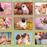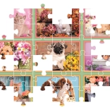 Kollázs rengeteg kiskutyával (és kiscicával) virágok között, amely elbűvöli az állatkedvelőket, és összerakás után díszíti bármely gyerekszobát.
