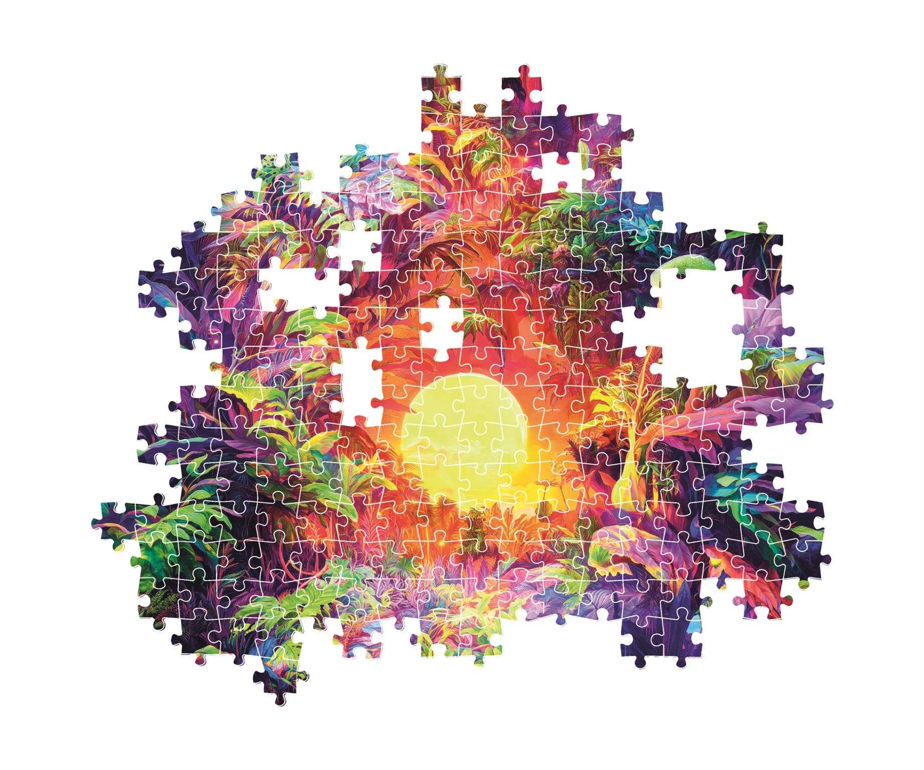 Lépjen be egy élénk kompozícióba a pszichedelikus napkelte trópusi dzsungel-motívumával. A kompakt csomagolás hely- és környezetkímélő, mégis teljes értékű kirakóélményt nyújt. A minőségi nyomat és a precíz stancolás zökkenőmentes illesztést és kopásállóságot garantál.