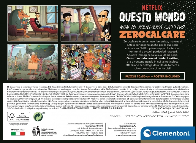 Fedezze fel a prémium puzzle-t a népszerű Netflix-sorozat, az Ez a világ nem fog legyőzni (Zerocalcare II) egyedi grafikájával. A minőségi nyomtatásnak és élénk színeknek köszönhetően minden perc kirakás élmény, a kész kép pedig keretben is remekül mutat.