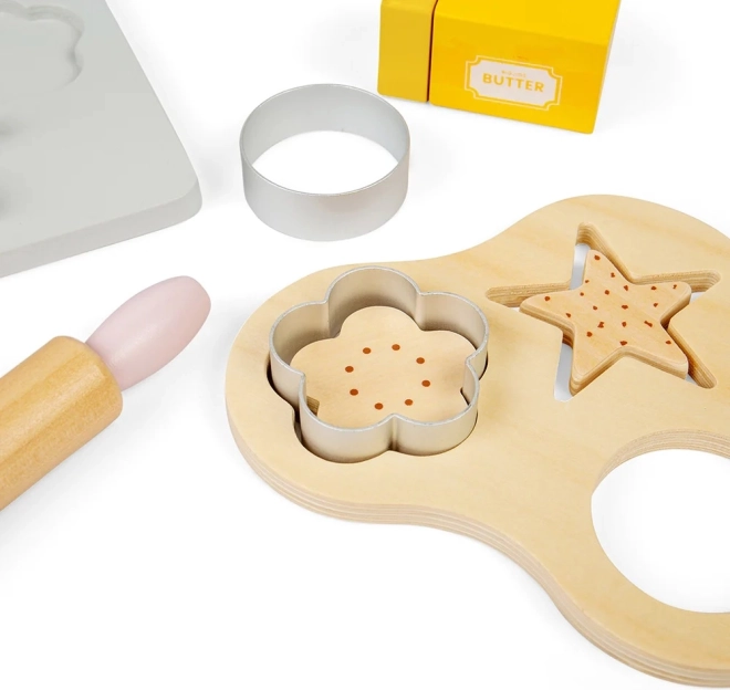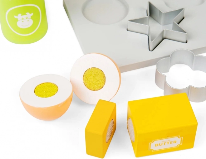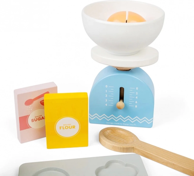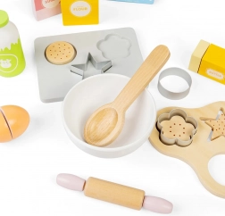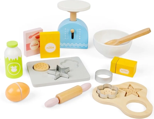 Ezzel a gyerek fa sütőkészlettel órákon át tarthat a szórakozás, miközben a gyerekek képzeletét is fejleszti. A készlet tartalmaz fa sütőtepsit, mérleget, kiszúrókat, sodrófát, tálat, vajat, tojást, lisztet, cukrot és tejet. A konyhabiztonság megtanulása szórakoztató és játékos formában.
