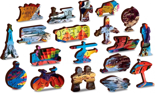 Elegáns és szórakoztató kihívás a kirakók szerelmeseinek. A hőlégballon-motívumú fa puzzle egyedülálló élményt nyújt a 61 különlegesen formázott állat-, épület- és tárgyalakú elemmel. Néhány darab önálló kis figuraként is felállítható, így a puzzle remek ajándék és stílusos dekoráció is.