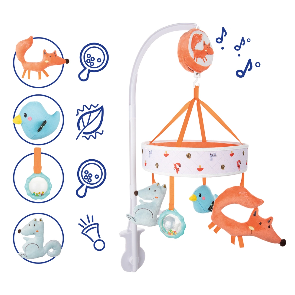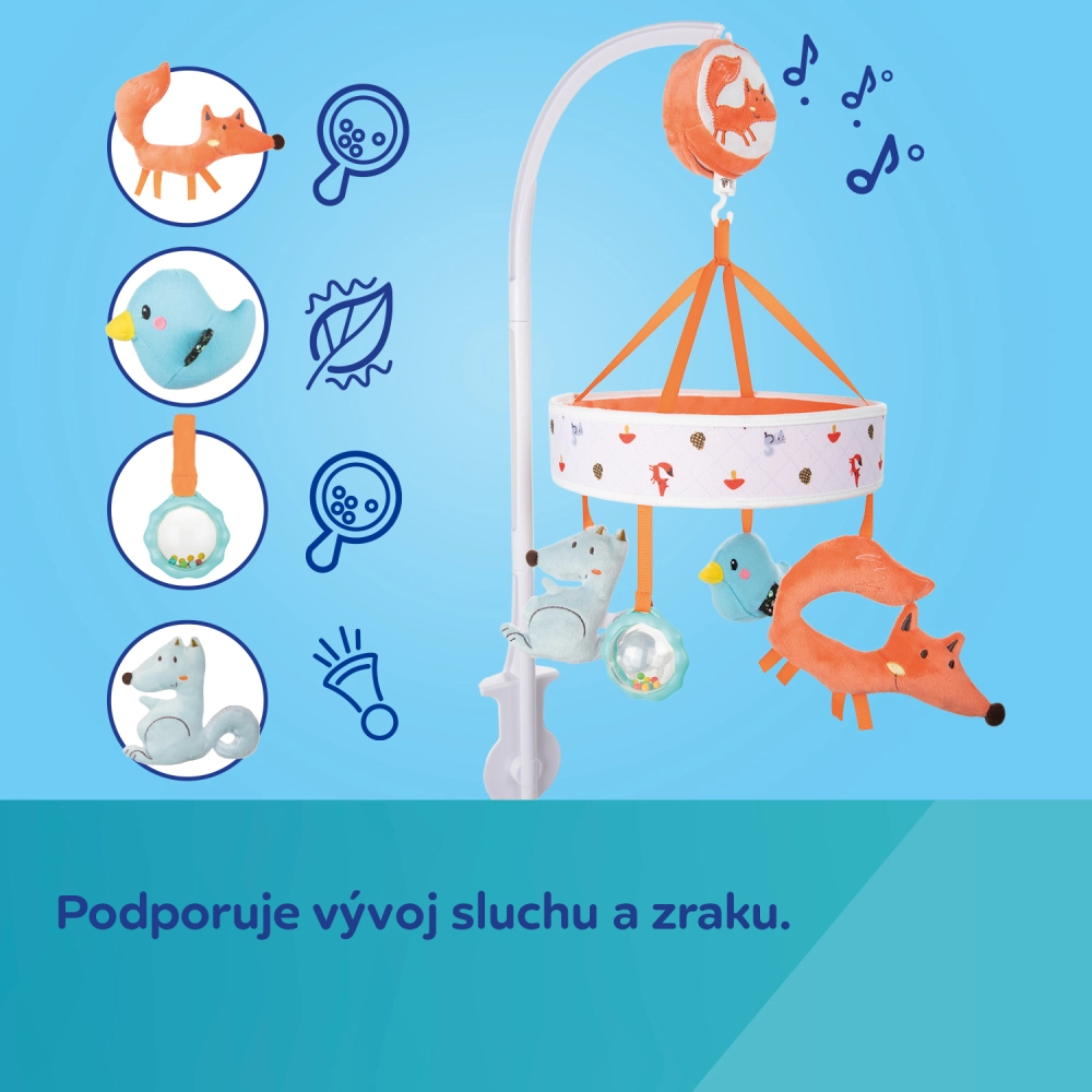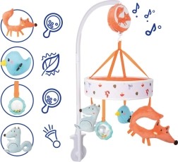 A színes kiságyra szerelhető körforgó a FOX kollekció bájos plüss állataival felkelti a baba figyelmét, és kellemes elalvási rutint teremt. A kézzel felhúzható szerkezet nyugtató dallamokat játszik, amelyek megnyugtatják a gyermeket és megkönnyítik az elalvást – elemek nélkül.