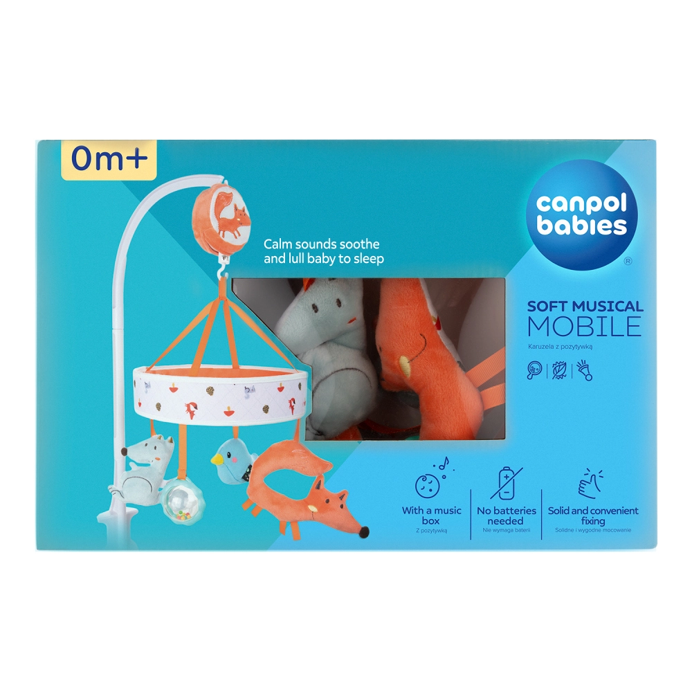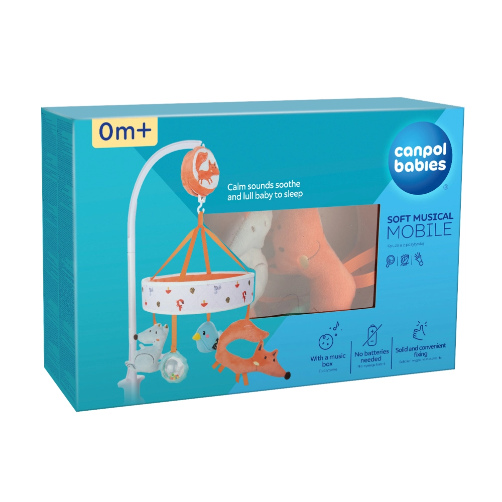 Nyugtasd meg kisbabádat, és támogasd fejlődését élete első napjaitól a CANPOL Babies FOX kollekció plüss körforgójával. A kézzel felhúzható szerkezetnek köszönhetően nem igényel elemet, és lágy dallamokat, plüss figurákat valamint megbízható kiságyrögzítést kínál. A körforgó stimulálja a látást, a hallást és a szem–kéz koordinációt, és megkönnyíti az elalvást.