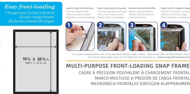 Fedezd fel a puzzleid kiállításának hatékony módját a Eurographics klipkeretekkel. Ez az innovatív klipkeret 48,89 x 67,63 cm méretű puzzle-khez lett tervezve, beleértve különféle puzzle-típusokat, mint a Eurographics 1000 darabos vagy a Eurographics XL 500 darabos. A függőleges és vízszintes felfüggesztési lehetőséggel rugalmas elhelyezést kínál.