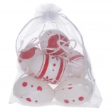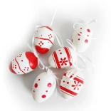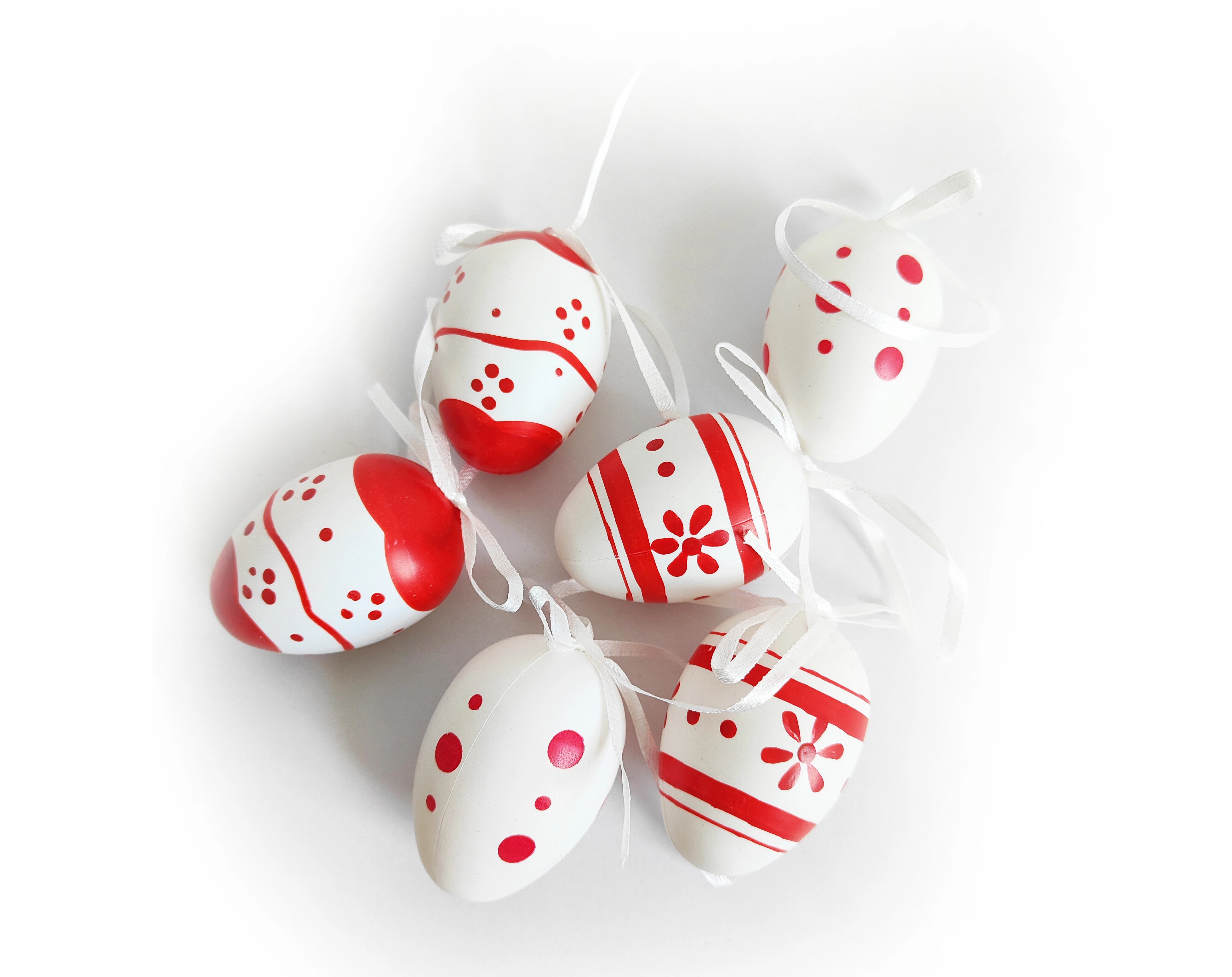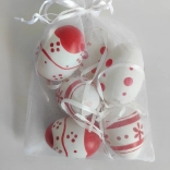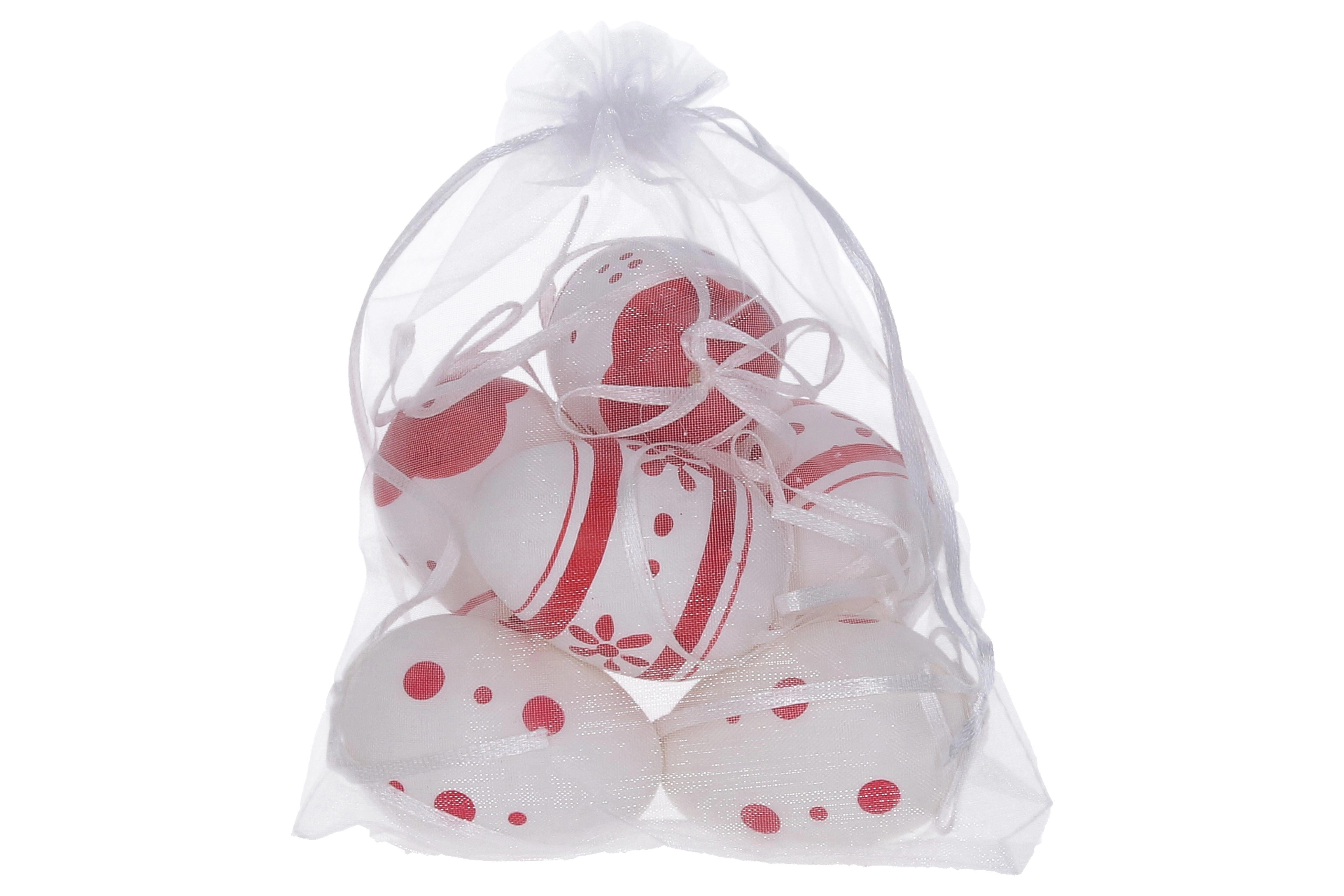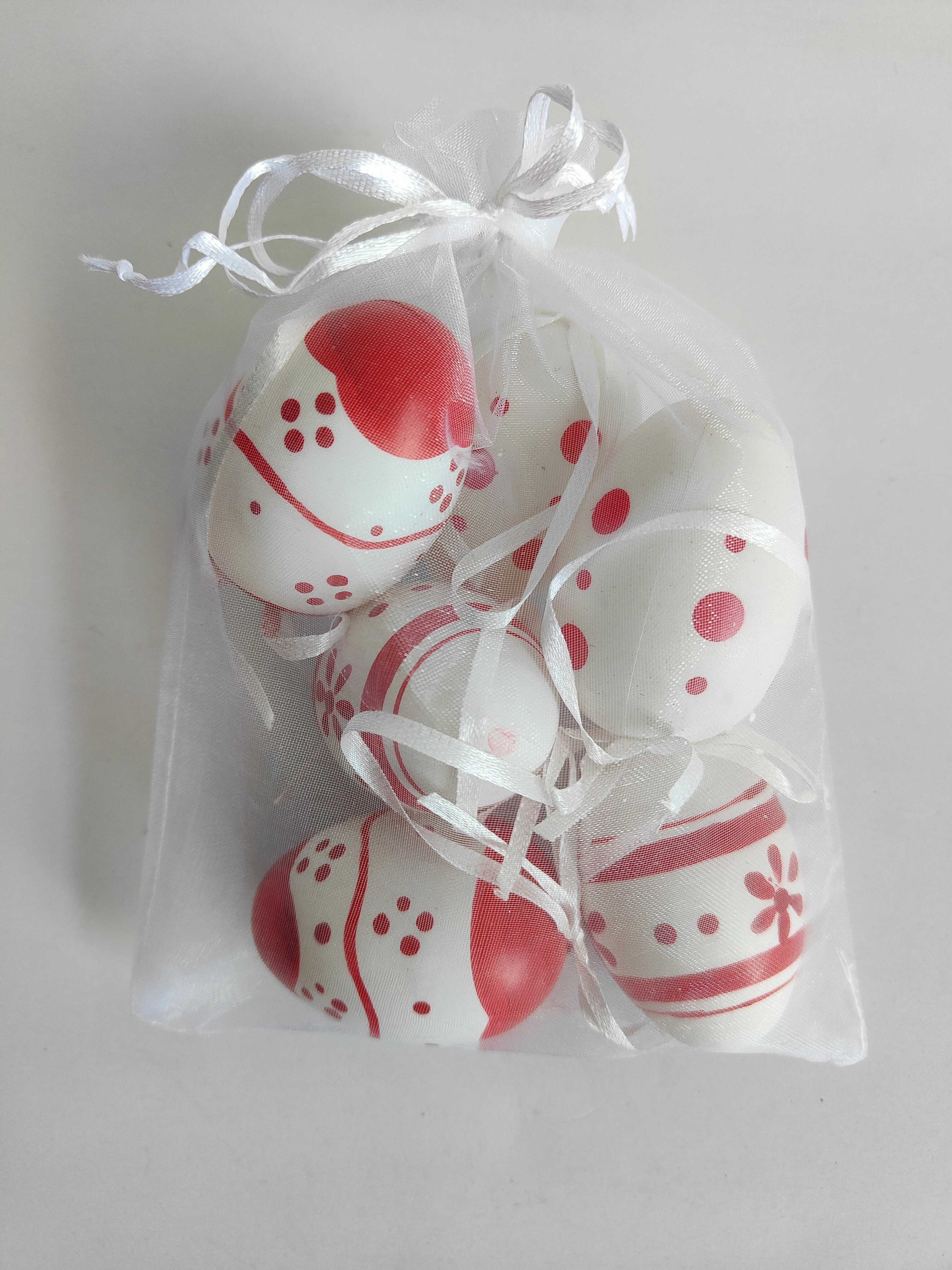 A 6 cm méretű, díszesen festett műanyag tojások ideálisak ünnepi dekorációkhoz. 6 darabot kap elegáns organza tasakban.