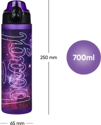 Stílusos, galaxismintás tritán kulacs 700 ml űrtartalommal, ideális iskolába, kiránduláshoz és sporthoz. Rendelkezik zárható tetővel, szivárgásmentes tömítéssel és praktikus hordozópánttal. BPA-mentes, tanúsított tritánból készült – szagtalan és biztonságos a mindennapi használatra.