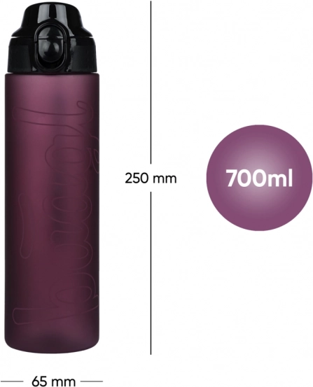 A 700 ml kapacitás kompakt testben (kb. 250 × 65 mm) elfér a hátizsákban és a palacktartóban is. Ideális iskolába és sporthoz.
