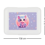 A színes cicás mintával díszített, lila hátterű tető feldobja az uzsonnát, és motiválja a gyerekeket a rendszeres étkezésre.
