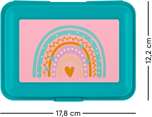 Ez az uzsonnás doboz büszkélkedhet színes szivárványos dizájnnal, ami vidám és játékos elemeket ad minden ebédhez.