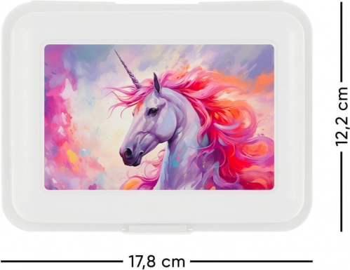 A műanyag doboz színes unikornis motívummal díszített, élénk rózsaszín és lila árnyalatokkal, amely különösen a gyerekek figyelmét vonzza és örömet okoz.