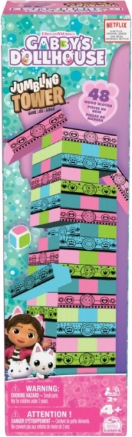 A játék 48 fa blokkból áll kék, rózsaszín és zöld színben, és a Gábi varázslatos házikója kedvelt motívumaival vizuálisan vonzó. A gyerekek lelkesedni fognak a dizájnok és az ikonikus karakterek miatt. Az extra szórakozásért a játék színes kockával is bővül, amely meghatározza, melyik blokkot kell eltávolítani.
