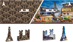 A puzzle darabjai híres épületeket, állatokat és tárgyakat ábrázolnak, a tematikus motívumnak megfelelően.