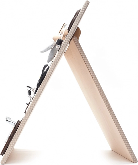 Az összeszerelés gyors és magától értetődő – a csomag mindent tartalmaz. Az állvány helytakarékos, és biztosítja a megfelelő szöget a táblán lévő zárak, zsanérok és egyéb elemek kényelmes felfedezéséhez.