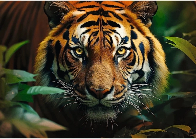 Fedezze fel a természet szépségét a 1000 darabos kirakóval, amelyen egy lomb között megbúvó, fenséges tigris látható. Összerakva 68,3 × 48 cm méretű képet alkot. Környezetbarát anyagokból készült, speciális kalanderezett papírral a kisebb tükröződésért és a kényelmesebb kirakásért.