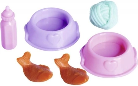 A csomag különféle játékokat és kiegészítőket tartalmaz, amelyek az állatok valódi szükségleteit imitálják, mint például szív alakú tálak vagy labda.
