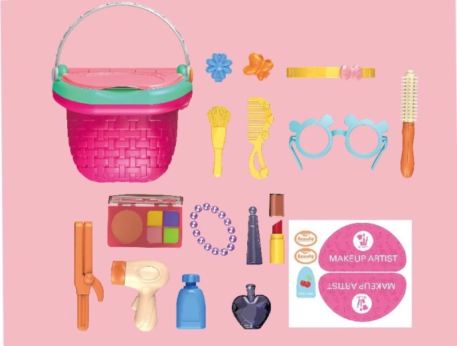 Fedezd fel a sminkelés és a hajápolás varázsát ezzel a bájos játékkészlettel a praktikus kosárban. Akár 18 kiegészítőt találsz benne, mint például parfüm, rúzs, szemhéjfesték, hajszárító és hajdíszek – ideális a kreatív játékhoz és a fantázia fejlesztéséhez.