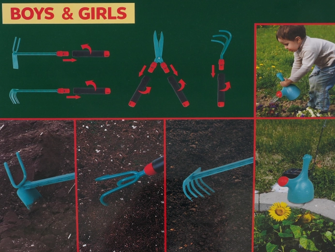Biztonságos kerti szerszámkészlet 3 éves kortól. A készlet mindent tartalmaz, ami a kerti munkához szükséges. Az eszközök biztonságosak, nincsenek éles élek, és ideális méretűek a kis kezekhez. A szerszámok nyelei ráadásul levehetők. A készlet univerzális színösszeállításban készült, amely fiúknak és lányoknak egyaránt ideális. |