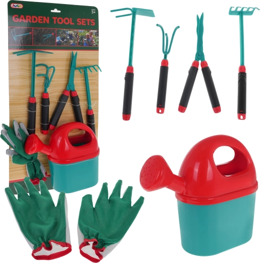 - kesztyű kb. 21,5 cm x 12,5 cm, felső rész szélessége 7,5–10,5 cm, ujjak kb. 6 cm hosszúak, - nagy locsolókanna kb. 22 cm x 19,5 cm x 8 cm, - kapa kb. 26,5 cm x 10,5 cm x 4,5 cm, - kézi kultivátor kb. 21 cm x 5,5 cm x 5 cm, - olló kb. 24 cm x 9 cm x 2 cm, - gereblye kb. 26 cm x 6,5 cm x 5 cm, - tok kb. 28 cm x 58 cm x 8 cm. |