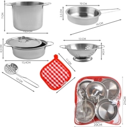 Ez a valósághű fém edény- és eszközkészlet ideális gyerekkonyhákhoz és szerepjátékhoz otthon, bisztróban vagy étteremben. A klasszikus ezüst megjelenés jól illik bármelyik gyereksarokhoz, az univerzális fedő pedig minden láboshoz passzol. Könnyű kialakításának és kompakt méreteinek köszönhetően a teljes készlet egyszerűen hordozható és elpakolható.