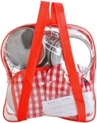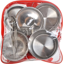 Teljes konyhai készlet kis szakácsoknak összesen 13 darabbal egy praktikus, átlátszó hátizsákban. Tartalmaz fém lábosokat, serpenyőt, szűrőt, univerzális fedőt és eszközkészletet, kiegészítve textil edényfogóval és alátéttel. Könnyű, hordozható és tartós szett, amely fejleszti a gyerekek kreativitását, motorikáját és társas játékát.