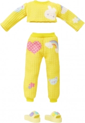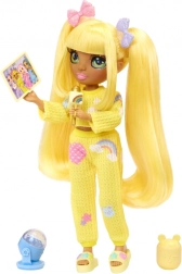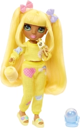 Sunny készen áll egy felejthetetlen pizsamapartira! Kétrészes sárga pizsamát visel szívecskékkel és szivárvánnyal, hozzá illő sárga mamuszokat, valamint hosszú, egyenes haját két copfba kötött masnik díszítik. Nagy üvegszemei és hosszú szempillái egyedi megjelenést kölcsönöznek a babának, amit a gyerekek imádni fognak.