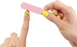 Reszelő, 2 szett öntapadós és újra levehető műköröm, csillámok és 2 „lakkos” üvegcse serkenti a fantáziát és fejleszti a finommotorikát.