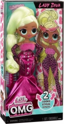 A L.O.L. Surprise! O.M.G. Lady Diva baba fényűző stílust, csillogó részleteket és feltűnő rózsaszín megjelenést hoz, amely első pillantásra magával ragad. A mozgatható ízületeknek köszönhetően remekül pózol és fotózható, míg a gazdag kiegészítő-kínálat támogatja az öltözékek kreatív kombinálását.