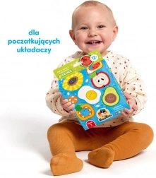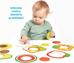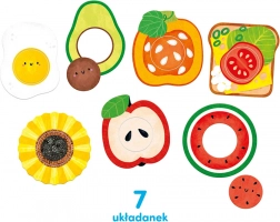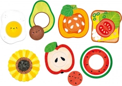 A kirakóval való játék természetes módon fejleszti a finommotorikát, a észrevételt és a türelmet. Együtt megnevezhetitek az ételeket, színeket és formákat, kereshettek hasonlóságokat és különbségeket, valamint kitalálhattok olyan kérdéseket, mint „Melyiknek van magja?” vagy „Hol van a tojás?”. A nagyobb gyerekek a darabokat felhasználhatják boltos vagy főzős játékhoz, illetve inspirációként saját rajzokhoz.