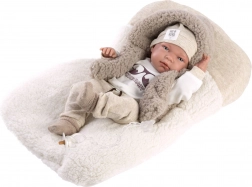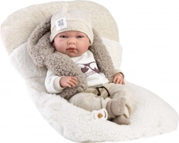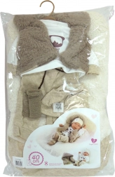 Stílusos és minőségi ruhaszett NEW BORN babához 40–42 cm-es méretben, amely mindent kínál a kényelmes öltöztetéshez és játékhoz. 5 részből áll, beleértve a kétoldalas párnát/alátétet, kézzel készült Spanyolországban, és praktikus csomagolásban, műanyag vállfával kerül szállításra. 3 éves kortól ajánlott.