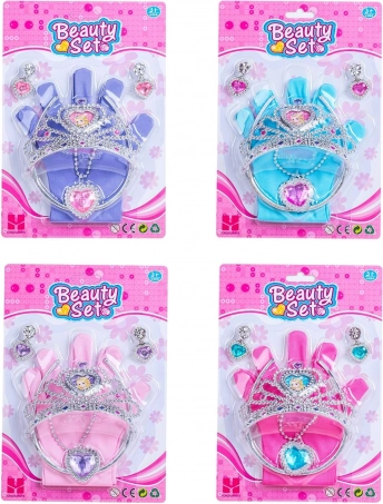 Varázslatos kiegészítőszett kis hercegnőknek, amely mindent tartalmaz, ami a csinoskodáshoz kell: kesztyűk, korona (12,5 cm), hajpánt, nyaklánc és fülbevalók. Elérhető 4 színváltozatban – kék, lila, rózsaszín és piros.